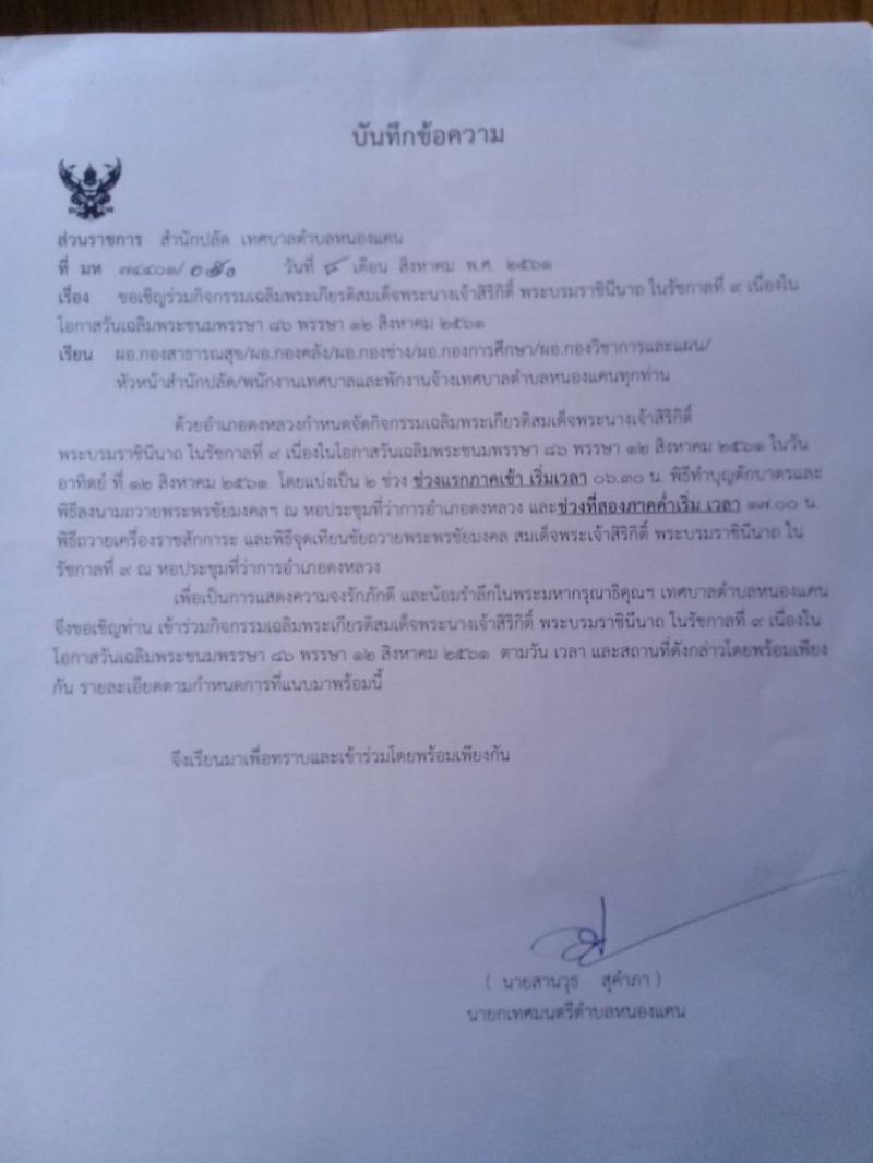 รายละเอียด : เทศบาลตำบลหนองแคนได้เข้าร่วมกิจกรรมฯกับอำเภอดงหลวงเพื่อแสดงความจงรักภัคดีเนื่องในโอกาสวันเฉลิมพระชนพรรษา ๘๖ พรรษา ๑๒ สิงหาคม ๒๕๖๑ ด้วยอำเภอดงหลวงกำหนดกิจกรรมเฉลิมพระเกียรติสมเด็จพระนางเจ้าพระบรมราชินีาถ ในรัชกาลที่๙ เนื่องในโอกาสวันเฉลิมพระชนพรรษา ๘๖ พรรษา ๑๒ สิงหาคม ๒๕๖๑ ในวันอาทิตย์ ที่๑๒ สิงหาคม ๒๕๖๑ โดยแบ่งเป็น ๒ ช่วง…