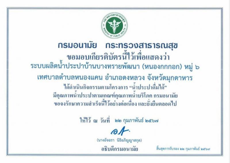 กรมอนามัย กระทรวงสาธารณสุข มอบเกียรติบัตรให้แก่ เทศบาลตำบลหนองแคน เรื่อง กิจกรรมโครงการ "น้ำประปาดื่มได้" มีคุณภาพน้ำประปาตามเกณฑ์คุณภาพน้ำบริโภค โดย นายสมเภท สุคำภา รองนายกเทศมนตรีตำบลหนองแคน เข้ารับเกียรติบัตร พร้อมด้วยคณะผู้บริหาร,และพนักงาน ณ ห้องประชุมแก้วกินรี ชั้น 5 ศาลากลางจังหวัดมุกดาหาร
