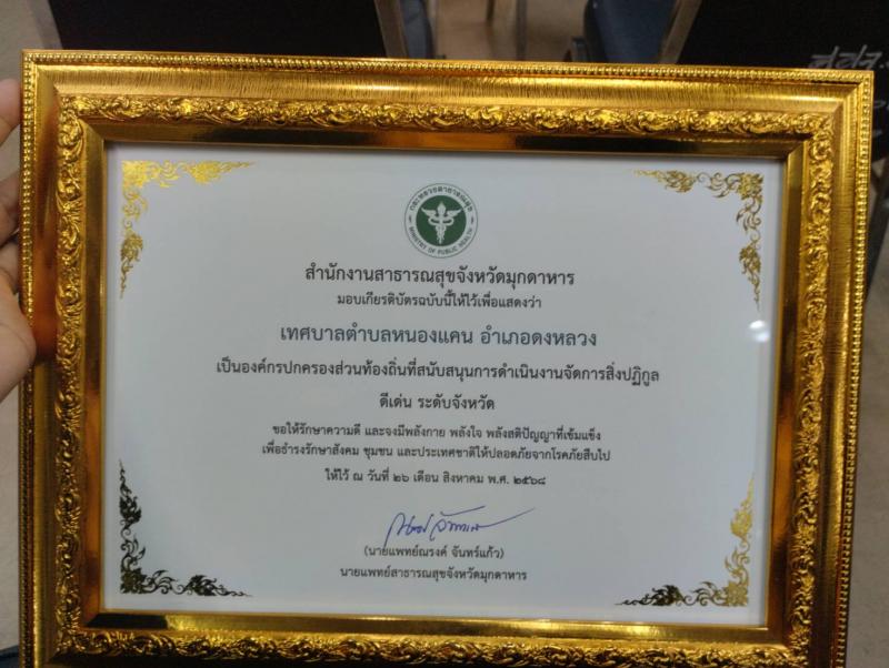 #เทศบาลตำบลหนองแคน โดย นายกเทศมนตรีตำบลหนองแคน มอบหมายให้นายบำเพ็ญ เชื้อวังคำ รองนายกเทศมนตรีตำบลหนองแคน พร้อมพนักงานกองสาธารณสุขและสิ่งแวดล้อม เข้ารับเกียรติบัตรเป็นองค์กรปกครองส่วนท้องถิ่น ที่สนับสนุนการดำเนินการจัดการสิ่งปฏิกูลดีเด่นระดับจังหวัด จากสำนักงานสาธารณสุขจังหวัดมุกดาหาร