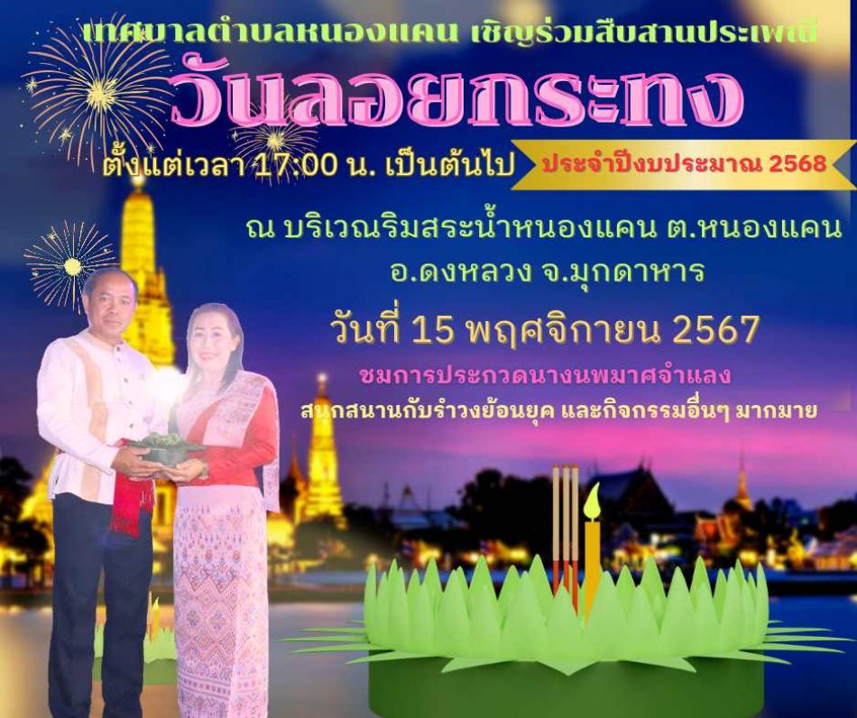 เทศบาลตำบลหนองแคน ขอเชิญร่วมงานสืบสานประเพณีวันลอยกระทง โครงการ"จัดงานประเพณีวันลอยกระทง ประจำปีงบประมาณ 2568 [14 พฤศจิกายน 2567]