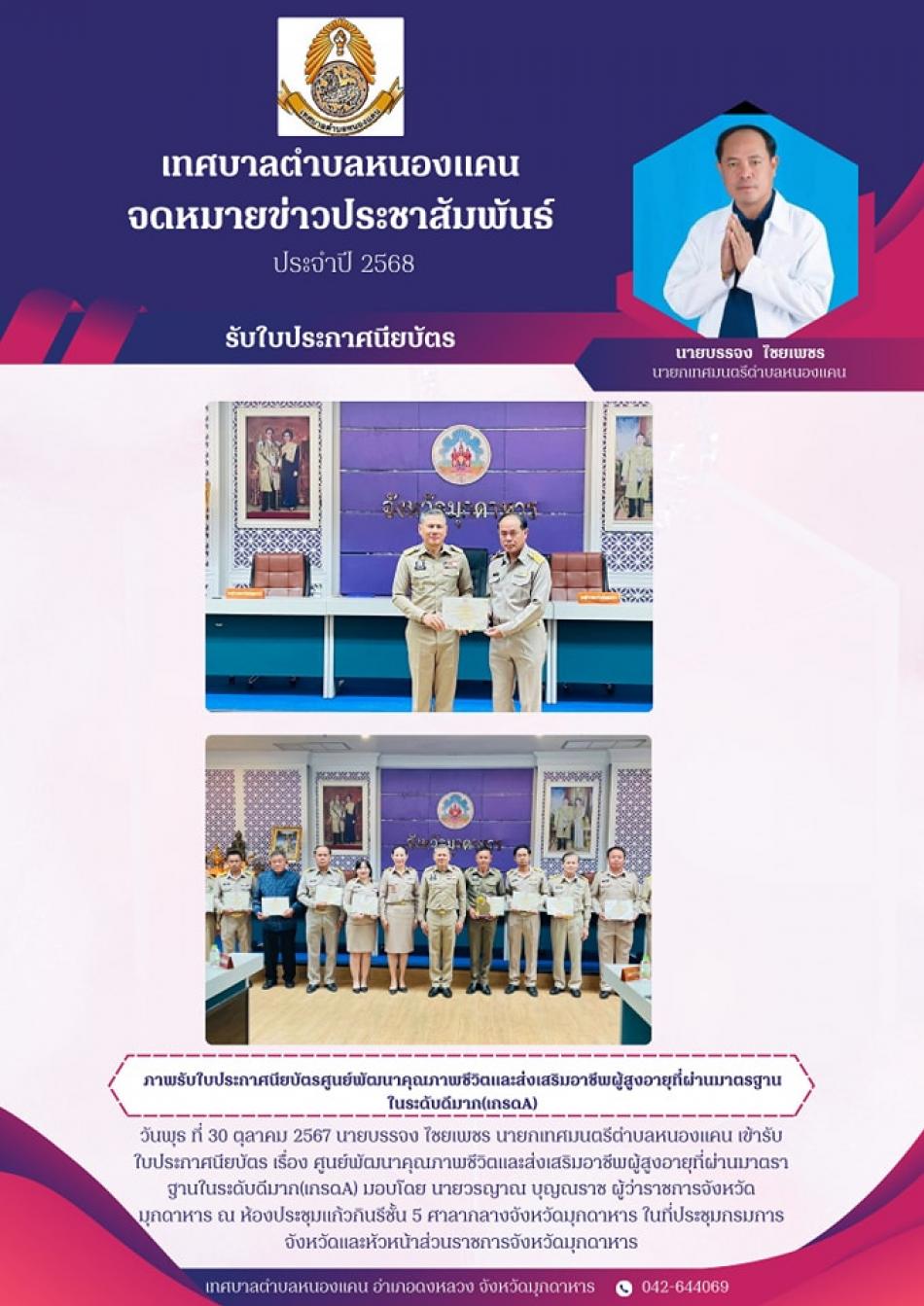 เทศบาลตำบลหนองแคนได้รับใบประกาศนียบัตร เรื่อง ศูนย์พัฒนาคุณภาพชีวิตและส่งเสริมอาชีพผู้สูงอายุที่ผ่านมาตราฐานในระดับดีมาก(เกรดA) [30 ตุลาคม 2567]