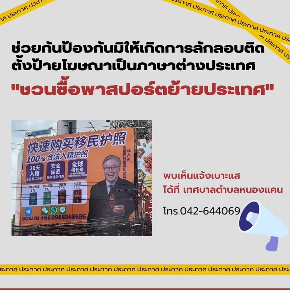 ขอประชาสัมพันธ์ เรื่อง การป้องกันมิให้เกิดการลักลอบติดป้ายโฆษณาเป็นภาษาต่างประเทศชวนซื้อพาสปอร์ตย้ายประเทศหรือพฤติกรรมที่มีลักษณะทำนองเดียวกัน [26 กันยายน 2567]