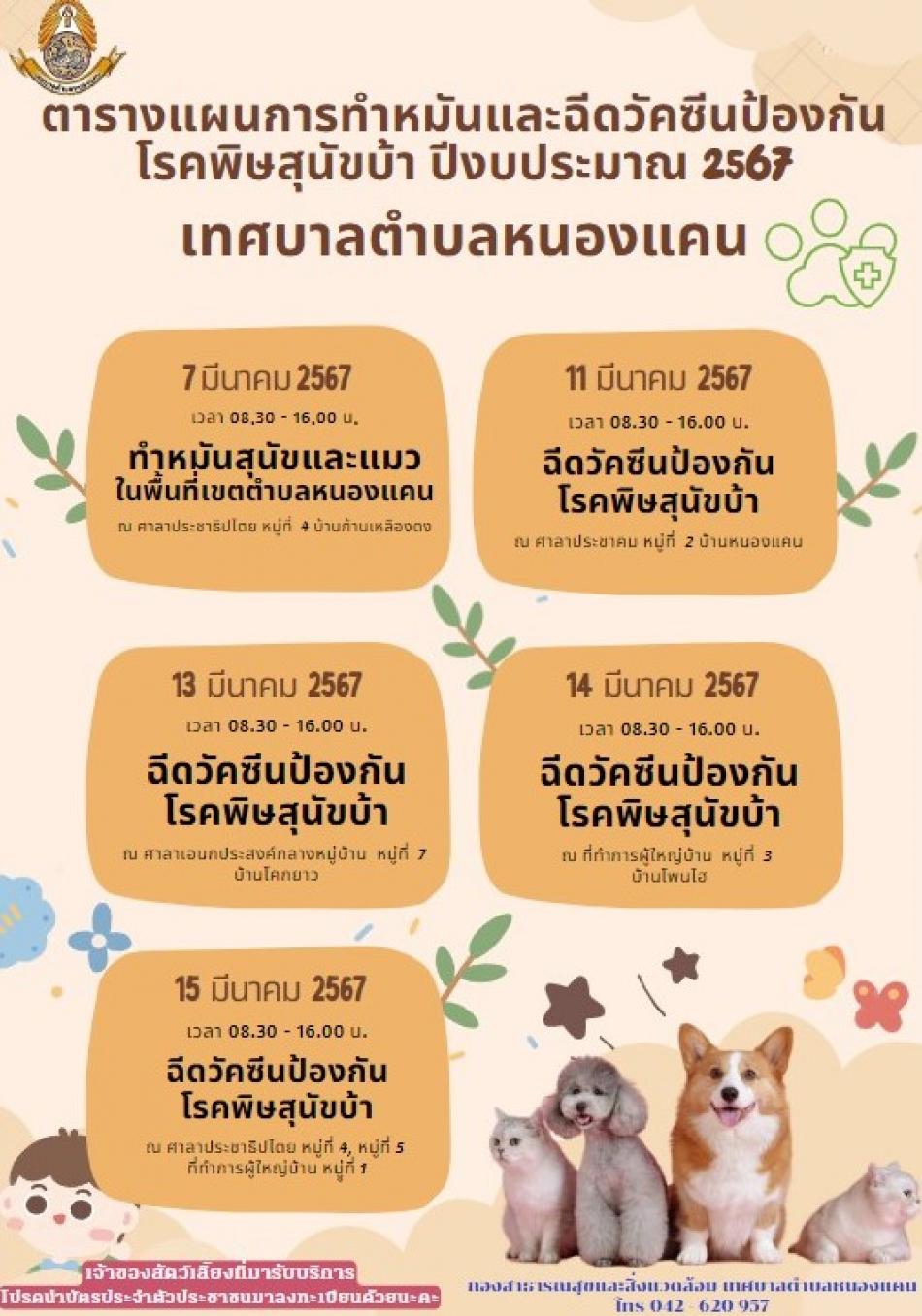 ขออนุญาตประชาสัมพันธ์ แจ้งเรื่อง ตารางแผนการกำหมันและฉีดวัคซีนป้องกัน โรคพิษสุนัขบ้า ปีงบประมาณ 2567 สอบถามเพิ่มเติมได้ที่โทร 042-644069 กองสาธารณสุขและสิ่งแวดล้อม สำนักงานเทศบาลตำบลหนองแคน [6 มีนาคม 2567]