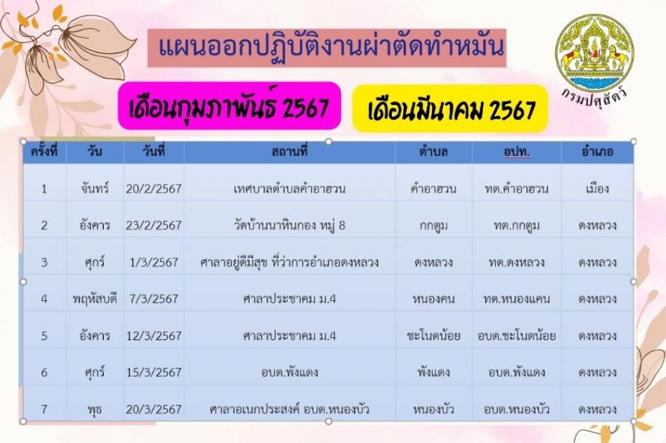 ขอประชาสัมพันธ์ เรื่อง แผนออกปฏิบัติงานผ่าตัดทำหมันสุนัขและแมว เดือน กุมภาพันธ์ 2567 เดือน มีนาคม 2567 [1 กุมภาพันธ์ 2567]