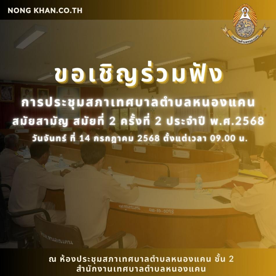 ขอเชิญร่วมรับฟังการประชุมสภาเทศบาลตำบลหนองแคน สมัยสามัญ สมัยที่ 2 ครั้งที่ 2 ประจำปี พ.ศ.2568 [9 กรกฎาคม 2568]