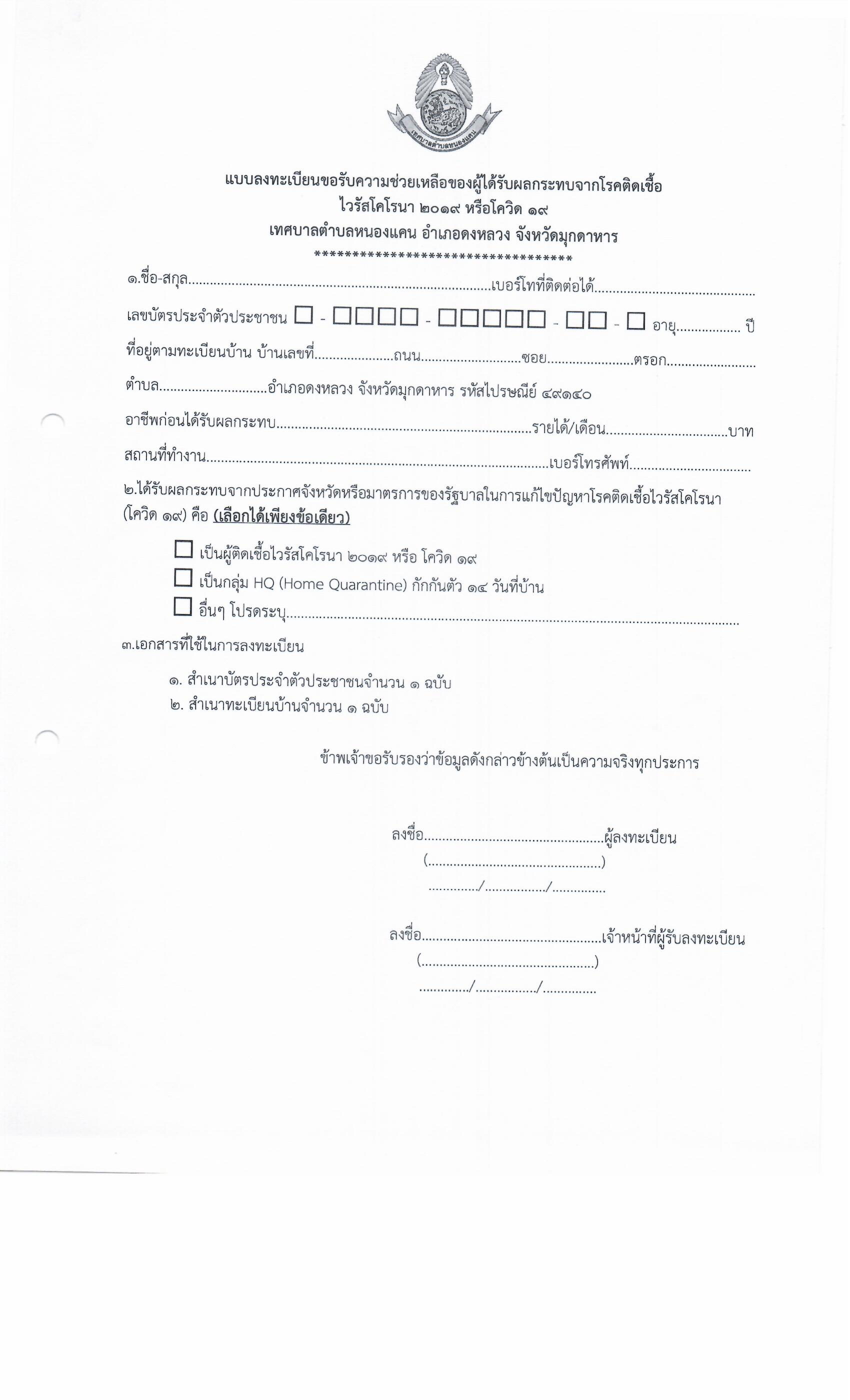 ประกาศเทศบาลตำบลหนองแคน เรื่อง การยื่นลงทะเบียนรับความช่วยเหลือประชาชนผู้ได้รับความเดือดร้อน กรณีได้รับผลกระทบจากการแพร่ระบาดเชื้อไวรัสโคโรนา 2019 (โควิด - 19)