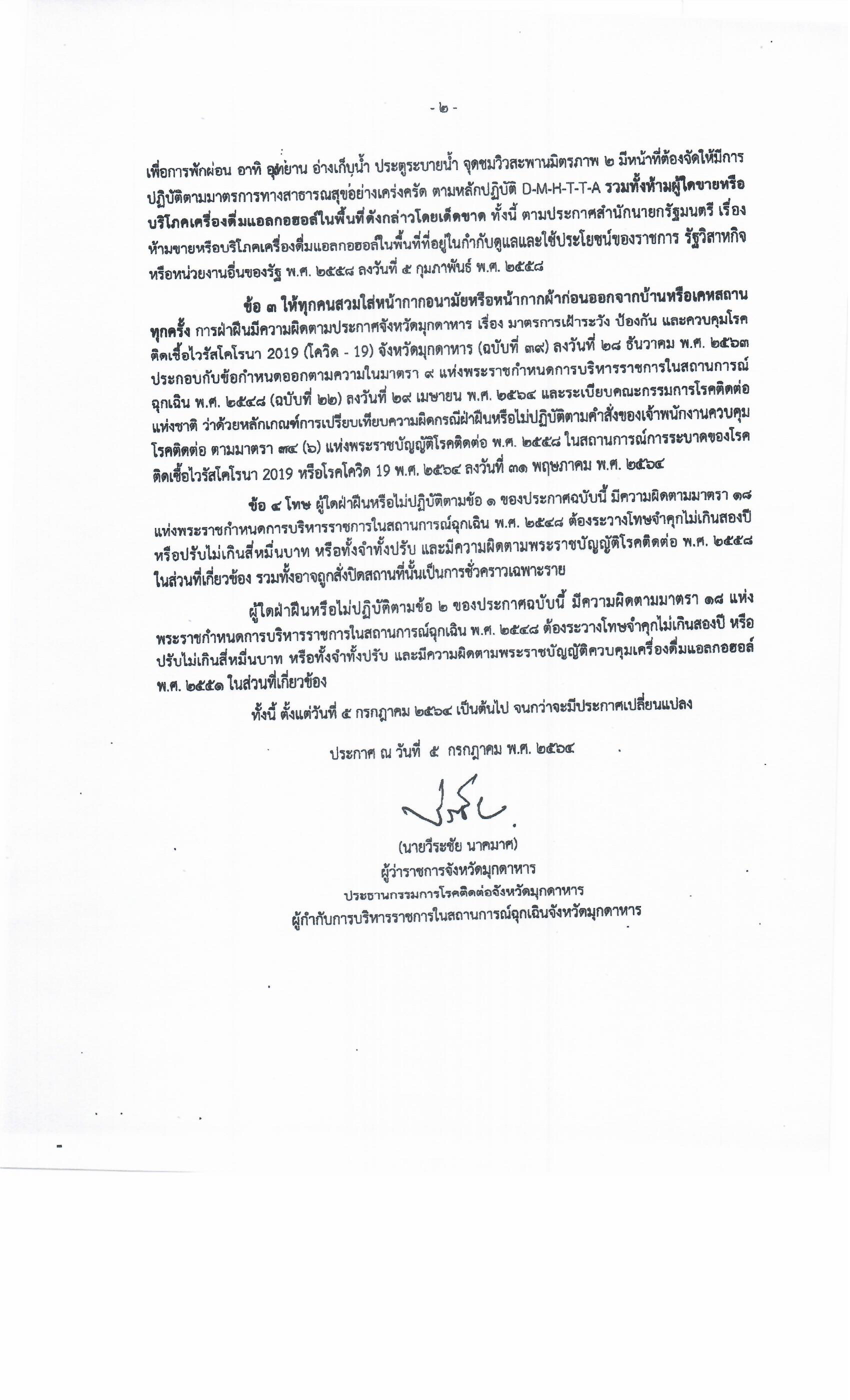 คำสั่งจังหวัดมุกดาหาร ที่ 3084/2564 เรื่อง ปิดสถานที่เสี่ยงต่อการแพร่ของโรคเป็นชั่วคราว และห้ามดำเนินการหรือจัดกิจกรรมที่เสี่ยงต่อการแพร่โรค