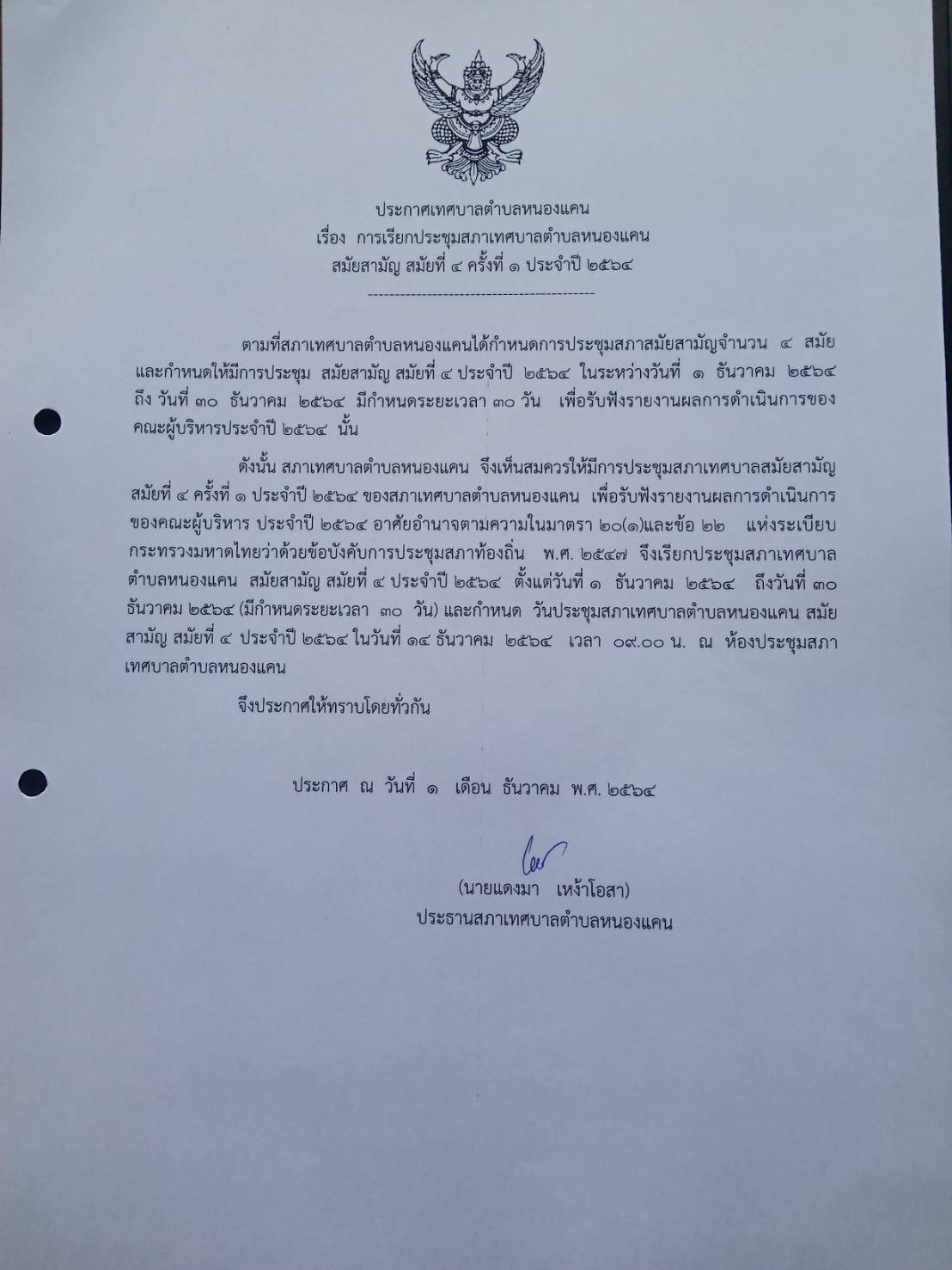 การเรียกประชุมสภาเทศบาลตำบลหนองแคน สมัยสามัญ สมัยที่ 4 ครั้งที่ 1 ประจำปี 2564