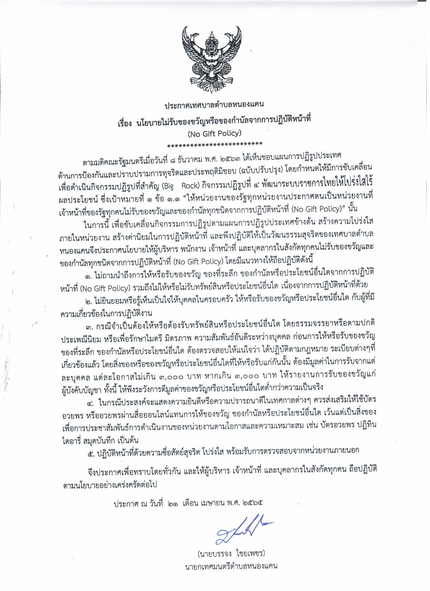 ประกาศ เรื่อง นโยบายไม่รับของขวัญหรือของกำนัลจากการปฎิบัติหน้าที่
