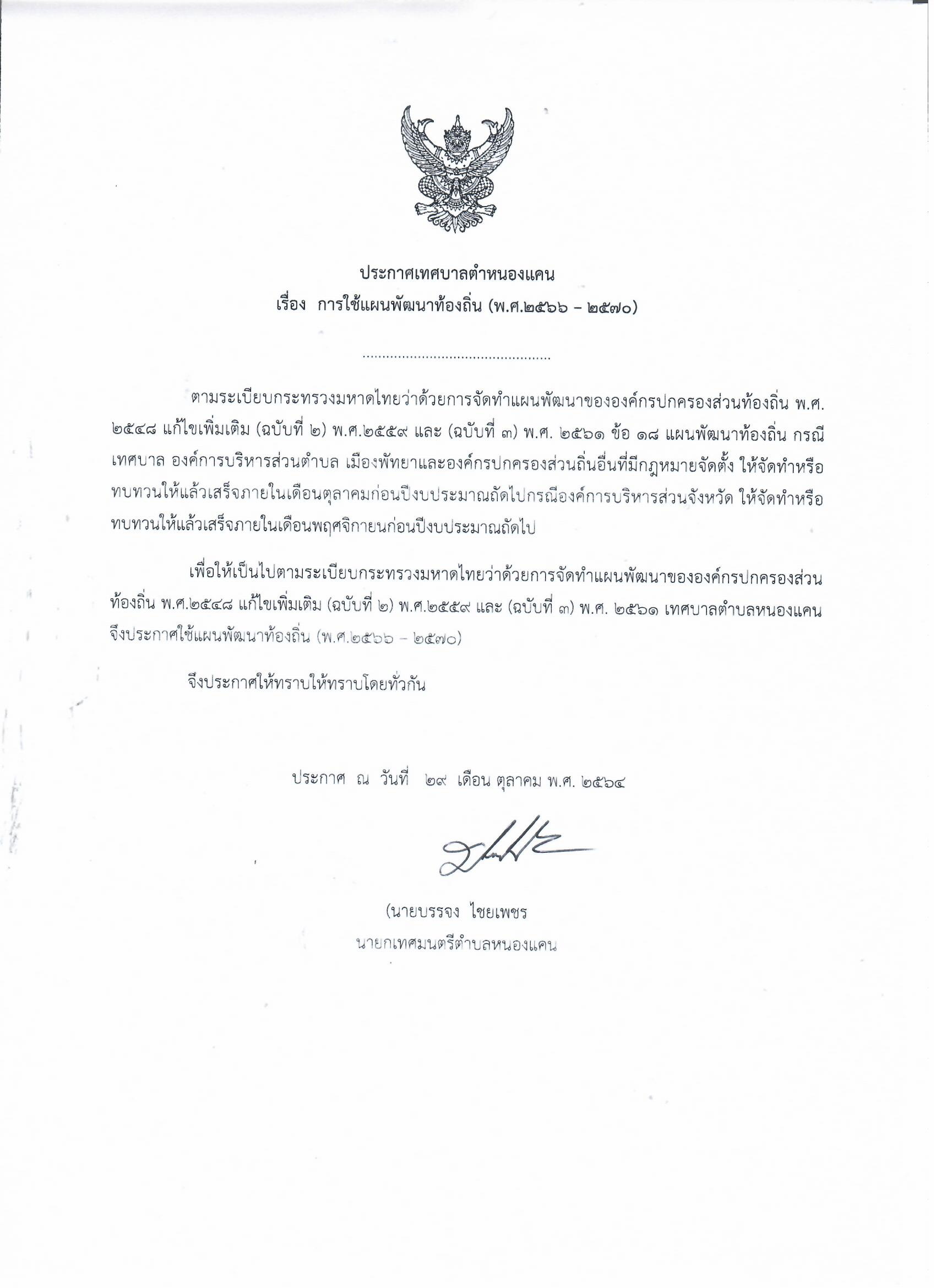 ประกาศเทศบาลตำบลหนองแคน เรื่อง การใช้แผนพัฒนาท้องถิ่น (พ.ศ.2566 - 2570)