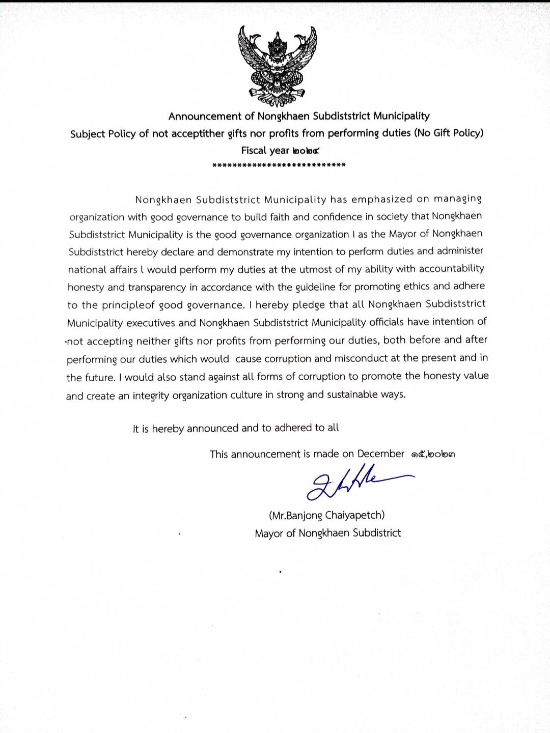 ชื่อเรื่อง : ประกาศ เรื่อง นโยบายการไม่รับของขวัญและของกำนัลทุกชนิดจากการปฏิบัติหน้าที่ (No Gift Policy) ฉบับ ภาษาอังกฤษ