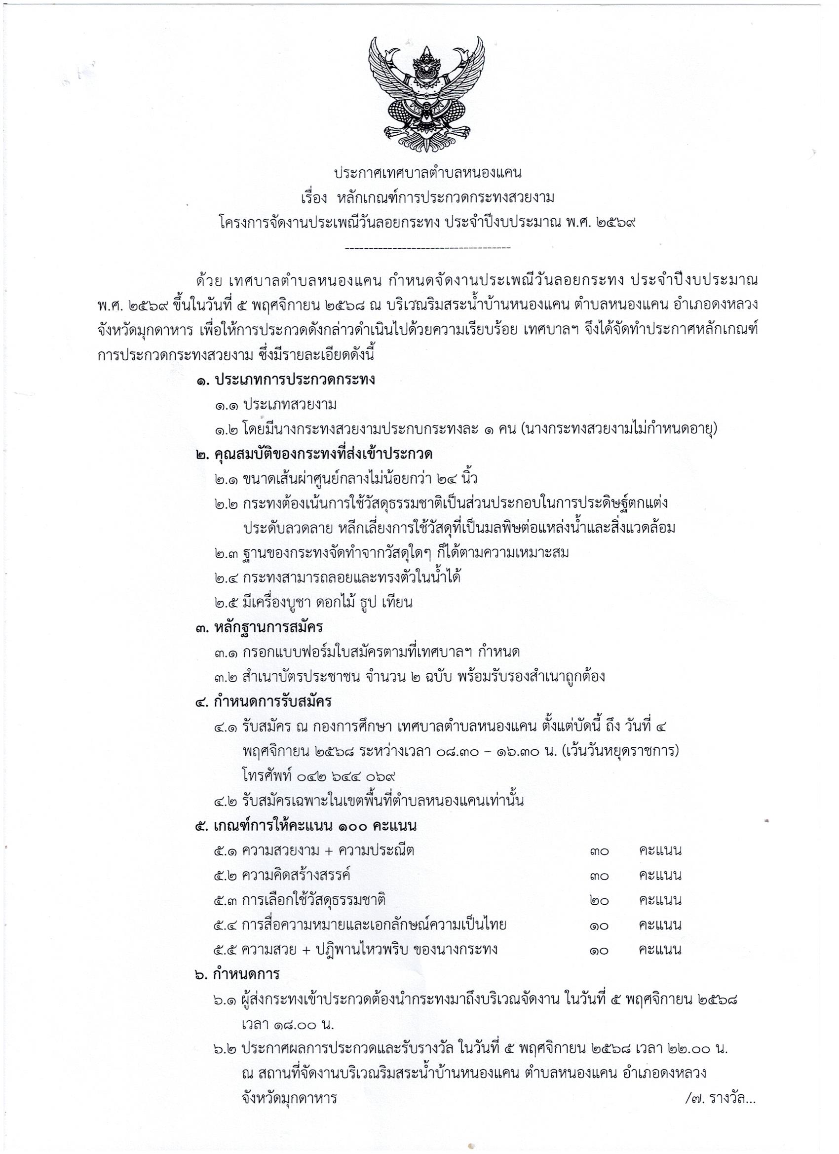 หลักเกณฑ์การประกวดกระทงสวยงาม โครงการจัดงานประเพณีวันลอยกระทง ประจำปีงบประมาณ พ.ศ.2569